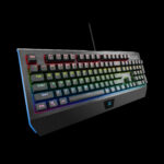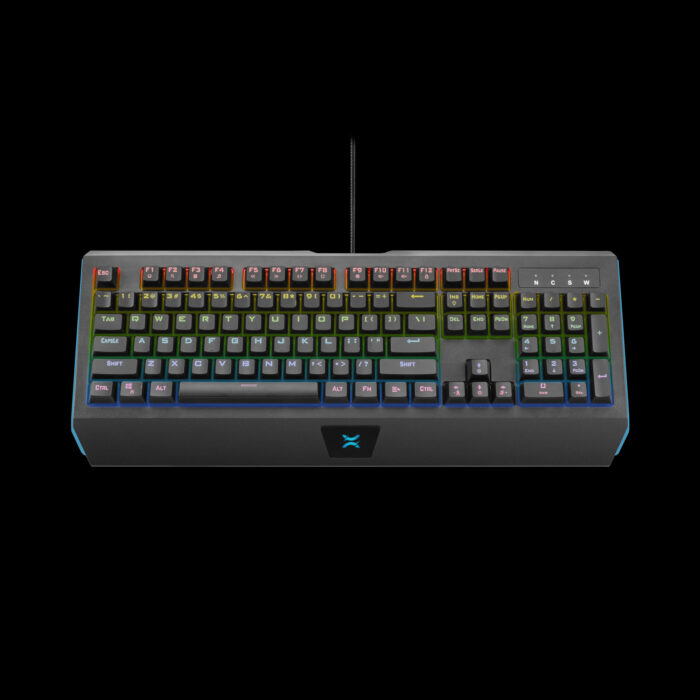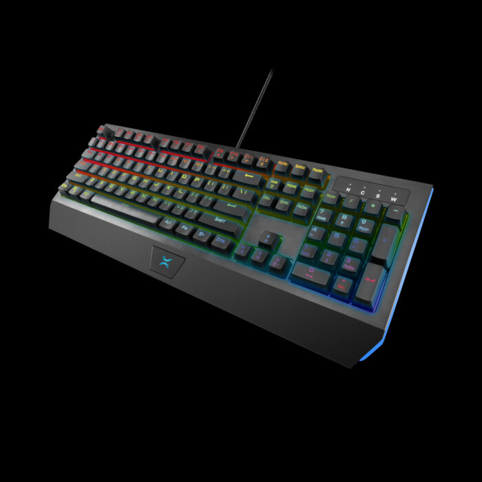 Mechanical gaming keyboard with rainbow backlight custom backlight presets, dedicated software and cable management groove.